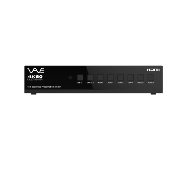 This 5×1 seamless presentation switch includes 3 HDMI inputs, 2 USB-C inputs (with DP Alt mode, USB 2.0, 100M Ethernet, and 60W charging), 1 HDMI output, and 1 HDBT mirrored output. The HDBT output supports standard PoE power and can extend uncompressed signals up to 230ft/70m at 4K@30Hz 4:4:4 or 131ft/40m at 4K@60Hz 4:4:4 over a single CAT6A (F/FTP) cable. The switch offers flexible display options, including single screen or various multiview modes (Single/PIP/PBP/Triple/Quad). It supports USB 2.0 local KVM switching and Hub/HDBT USB pass-through (from TX to RX), as well as bi-directional RS-232 and IR control signal pass-through. Additionally, it features 1 analog audio input, 1 analog audio output, and Dante 2×2 audio input and output. The built-in 3×3 audio matrix includes independent audio EQ, volume, and delay adjustments